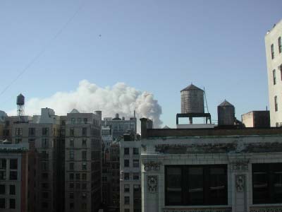 Через час башня рухнула после того, что очевидцы описали как серии из 15 взрывов внутри здания. Через полчаса после этого рухнула вторая башня, в результате чего южный Манхэттен оказался покрыт пеленой дыма и пыли.