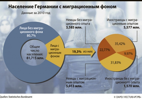Новые данные федерального статистического ведомства в Висбадене окончательно засвидетельствовали статус Германии как страны мигрантов: одна пятая жителей ФРГ – иностранцы или дети родителей, рождённых за пределами страны. В 2010 году, как и в предыдущих, их число росло и теперь составляет 15,7 миллиона человек, или 19,3 процента населения Федеративной Республики (19,2% в 2009 году, на 600 000 человек больше, чем в 2005 году). Большая часть из них – 8,6 миллиона – обладает немецким гражданством, остальные 7,1 миллиона немецкого паспорта не имеют.