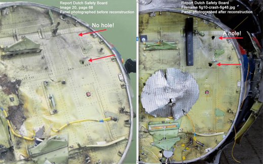 Извлеченные обломки самолета были сначала сфотографированы и зарегистрированы в Нидерландах Советом безопасности Нидерландов. Первое изобажение показывает первую фотографию СБН, на которой видна одна дырка. На втором изображении видно, что на новой фотографии, опубликованной СБН, есть вторая дырка. Посмотрите здесь.