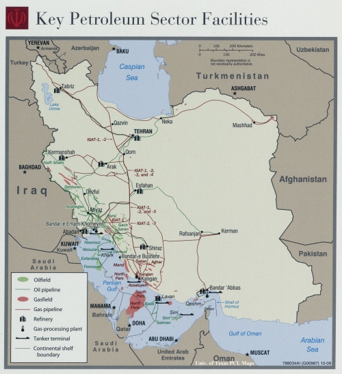 Надпись на карте: "Ключевые объекты нефтяного сектора (Ирана)"