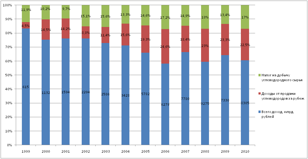 Для некоторой наглядности, хотя весьма спорной, можно посмотреть на динамику подобной структуры доходов федеральных бюджетов за 1999-2010 годы: