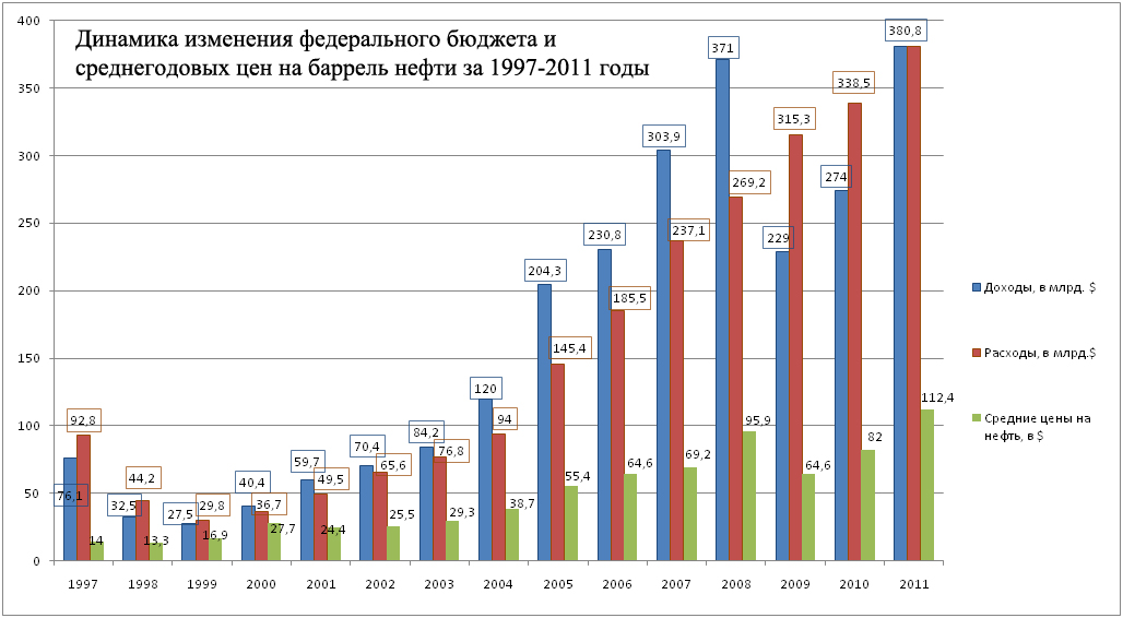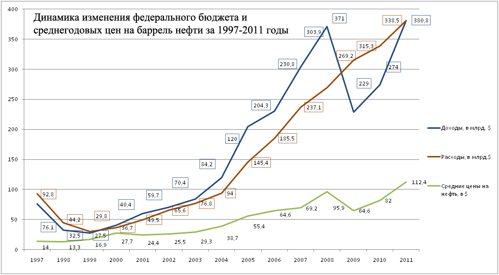 Для бОльшей наглядности давайте переведём федеральные бюджеты в доллары США по текущим курсам и сравним со средними ценами на баррель нефть: