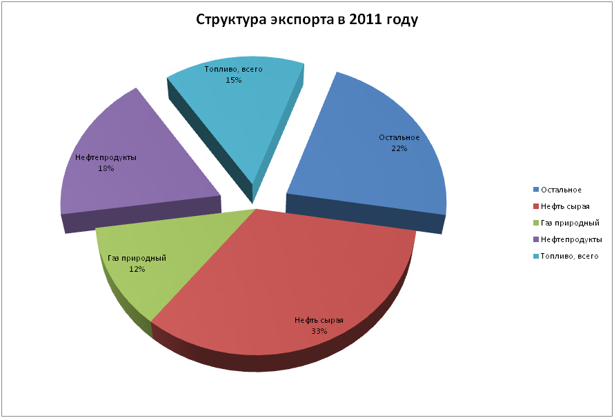 Как мы видим, доходы от внешнеэкономической деятельности и вправду в структуре бюджета составили 41%. Очень многие по незнанию считают, что вся эта позиция состоит из нефтегазовых доходов. Но это преувеличение. К сожалению, подробный разбор налоговых сборов от Казначейства за 2011 год пока ещё не опубликован, и придётся обратиться к структуре экспорта страны в 2011 году. Но хочу сразу предупредить, что структура экспорта и структура внешнеэкономической деятельности в бюджете может кардинально отличаться по объективным причинам. Однако всё равно давайте взглянем на неё: