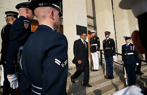 Министр обороны США Леон Панетта (в центре) спускается по ступенькам в ожидании канадского министра национальной обороны Питера Маккея в Пентагоне 28 сентября 2012 г. в Арлингтоне, штат Вирджиния. Алекс Уонг/Getty Images/AFP