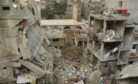 Здания, разрушенные, как утверждают активисты, ракетами, выпущенными истребителем сирийских ВВС, верным президенту Башару аль-Асаду, в Дарая рядом с Дамаском. 10 декабря 2012 г. (фото - Рейтер/Кенан Аль-Дерани)