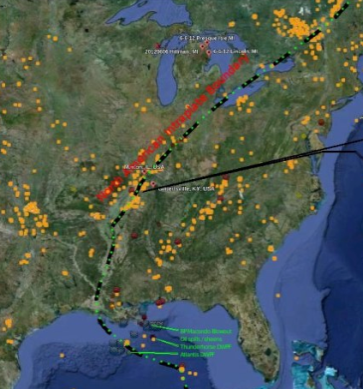 Области провала грунта последних лет, соединённые жёлтыми линиями (по данным nytransactions). Справа: фрагмент комбинированной карты единой сети тектонических разломов Ново-Мадридской, южной и глубоководной области Мексиканского залива. Оранжевыми точками показаны землетрясения (из ч. 14-5; по данным БК Лима). Внизу: Одна из карт последствий «распада» США в ходе грандиозной катастрофы (из ч. 11-1)
