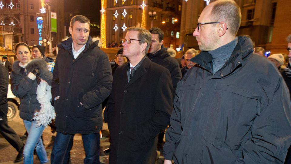 Министр иностранных дел Гидо Вестервелле энергично предостерег украинское правительство от применения насилия в отношении проевропейской оппозиции, объединившейся вокруг чемпиона мира по боксу Виталия Кличко. Во время встречи Организации по безопасности и сотрудничеству в Европе (ОБСЕ) в Киеве Вестервелле заявил, что Украина как текущий председатель ОБСЕ "обязана защищать мирных демонстрантов от любого рода запугиваний и насилия". О роли Германии он сказал: "Мы в Украине не выступаем на стороне какой-либо партии, мы выступаем за европейские ценности".