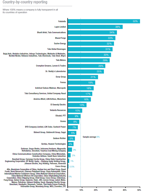 Доклад ТИ также сильно ограничен. Прозрачность "Русала" значительно разнится от страны к стране, в которых он работает. В таблице ТИ прозрачности по странам "Русал" занимает 27-е место, сильно отставая от аналогичных российских компаний - "Норильского Никеля" и "Евраза".
