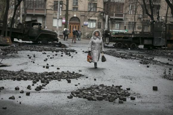 Женщина идет мимо сожженных грузовиков рядом со зданием парламента в Киеве, 23 февраля 2014 г. Фото: Рейтер/Baz Ratner