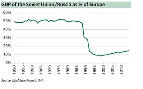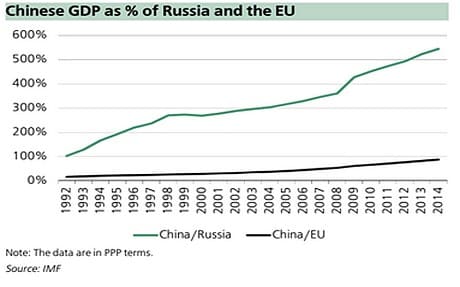 Это правда, что Россия не является той державой, которой она когда-то была, как можно видеть по графикам "Сбербанка", на которых показан ее относительный экономический размер по отношению к Китаю и Европе.