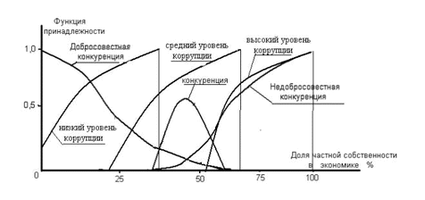 В данных рассуждениях никак не отображается суть власти в государстве. Поэтому здесь уместно остановится на выражении, которое очень часто приводят “борцы” с коррупцией: “всякая власть коррумпирована, но абсолютная власть коррумпирована абсолютно” (Л. Актон). Кажется, очень красиво сказано, но бессмысленно и ничего больше. Как соотносится доля частной собственности в государстве с абсолютной властью? Вот на что надо смотреть, а не выдавать лозунги. Еще одна особенность функций принадлежности – уменьшается значение добросовестной конкуренции, а значение уровня коррупции увеличивается и так до тех пор, пока конкуренция не становится недобросовестной, и ей соответствует высокий уровень коррупции. При 100% частной собственности в государстве (чего естественно не бывает) уровень коррупции зашкаливает – значение его функции принадлежности равно 1,0. Причина этого в том, что чем выше доля частной собственности в государстве, тем больше появляется субъектов, у которых есть из чего “дать”.