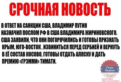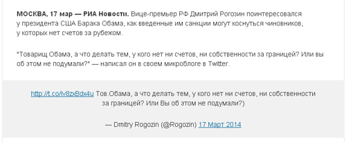 Судя по тому, что Белый Дом на полном серьезе заявил, что объявленные сегодня санкции являются "грозным предупреждением" для России, Вашингтон либо живет в какой-то иной реальности, не соприкасающейся с настоящим миром, либо над Бараком Обамой откровенно издеваются его же подчиненные. Либо, что для Обамы еще позорнее, его "российский отдел" подсовывает президенту США информацию, взятую из бложиков и конспирологических источников. Но тогда, блин, становится страшно за уровень компетенции Белого Дома, контролирующего крупнейший ядерный арсенал мира