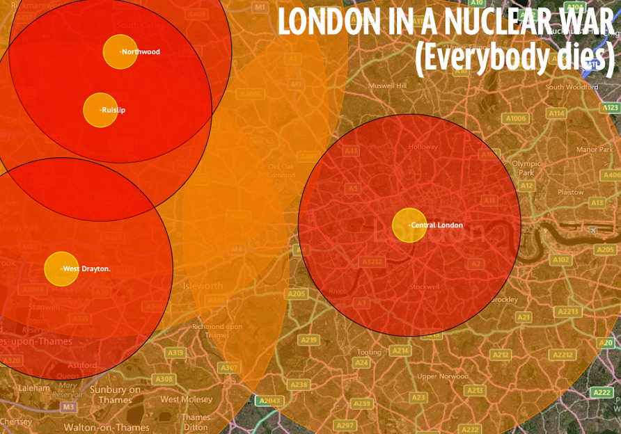 Очевидно что Советы сбросили бы, по меньшей мере “две - четыре бомбы мощностью до пяти мегатонн каждая”. Наша карта показывает, что, согласно веб-сайту Nuke map , может сделать одна бомба.