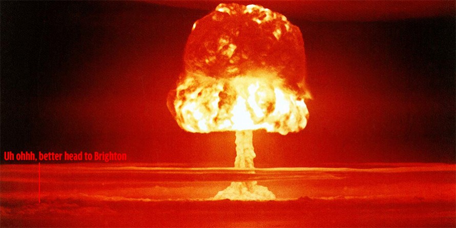 Brighton - находится аж в целых 50 милях от взрыва бомбы сброшенной на ближайшую к нему цель. Брайтон был бы НАШИМ выбором для того, чтобы пережить апокалипсис.