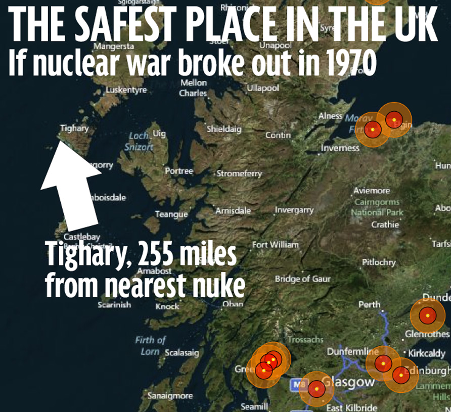 Tighary - в 255 милях от ближайшего атомного взрыва. Небольшая деревня на западе Норт-Уиста, где вы, вероятно, не увидели бы атомный гриб даже теоретически. Самое безопасное место в Великобритании.