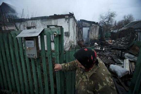 Женщина покидает разрушенный дом после того, как он был поврежден во время недавнего обстрела в западной части Донецка, восточная Украина, 27 ноября 2014 г.