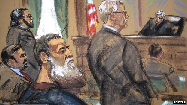 Зарисовка из суда показывает Абу Анаса аль-Либи с адвокатом Бернардом Клайнманом