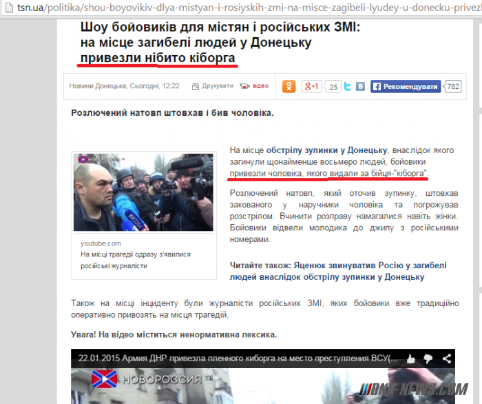 Сегодня, 22 января, на сайте ТСН появилась новость с таким заголовком: "Шоу боевиков для горожан и российских СМИ: на место гибели людей в Донецке привезли якобы киборга."