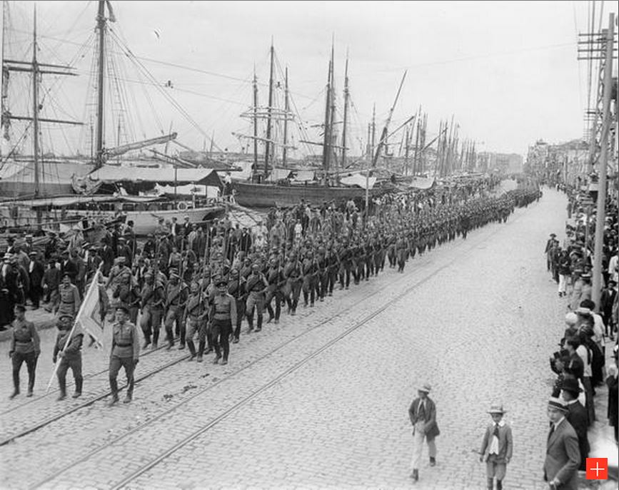 Русская армия в Македонской компании, 1915-1917 Русская пехота марширует по набережной после высадки в Салониках 30 июля 1916.