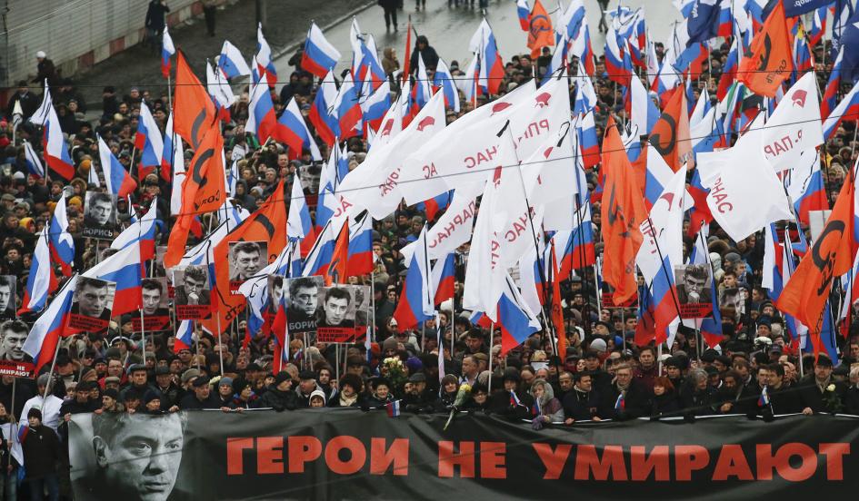В центре Москвы в воскресенье люди маршируют, чтобы почтить память кремлевского критика Бориса Немцова, который был застрелен в пятницу ночью. На плакате написано "Герои не умирают".Максим Змеев/Рейтер