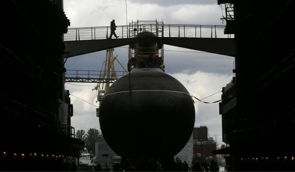 Церемония спуска на воду дизель-электрической подлодки "Ростов-на-Дону" на Адмиралтейских верфях в Санкт-Петербурге, 26 июня 2014 г. ALEXANDER DEMIANCHUK/REUTERS