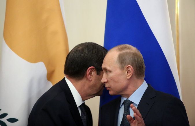 Президент Владимир Путин принимает своего кипрского коллегу Никоса Анастасиадиса в Москве в феврале. Credit Sasha Mordovets/Getty Images