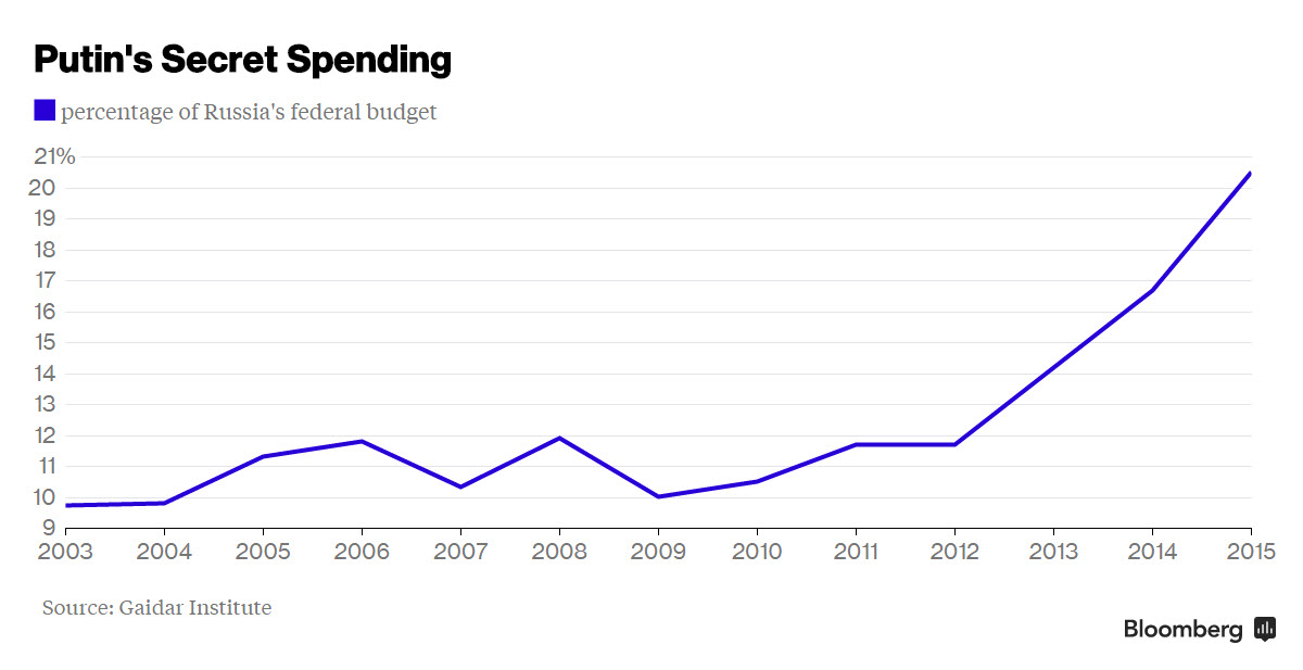 Согласно данным, собранным агентством Блумберг, Путин ассигнует беспрецедентные суммы из секретных фондов, для того чтобы ускорить самое большое, после Холодной войны, наращивание военного потенциала России. По оценкам Института Гайдара, независимого мозгового центра в Москве, так называемая «черная» часть федерального бюджета, согласованная, но не детализированная, удвоилась с 2010 года - до 21 % и теперь составляет 3.2 триллиона рублей (60 миллиардов долларов).