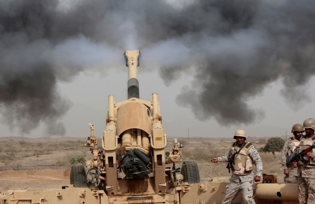 Саудовские солдаты стреляют из артиллерийского орудия по трем машинам с оружием, приближающимся к саудовской границе с Йеменом, в Джазане, Саудовская Аравия, в понедельник, 20 апреля 2015 г. (Фото - АП/Хасан Джамали)