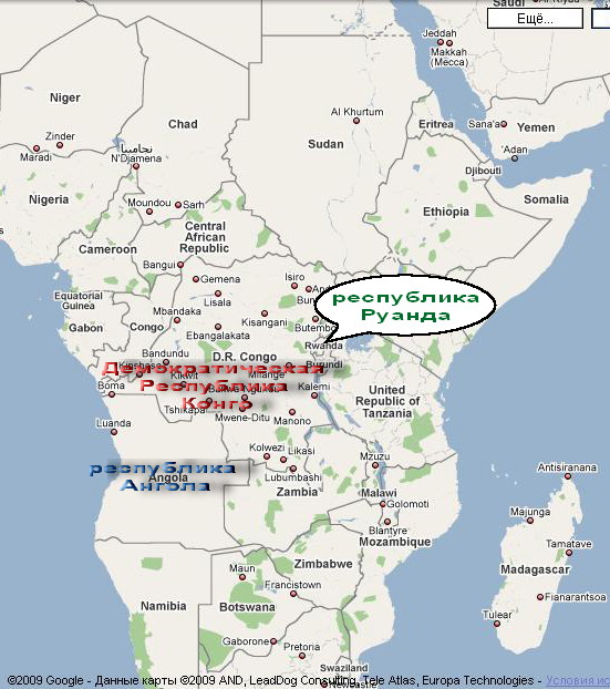 Демократическая Республика Конго – третье по территории в Африке и 12 в мире государство. До 1960 года – колония Бельгии, с 1965 по 1997 годы – республика Заир. Площадь территории – 2 345 410 кв. км, население – 63 655 000 чел, государственный язык – французский. Недра страны содержат запасы меди, кобальта, кадмия, бокситов, железной руды, алмазов, золота, серебра, нефти, цинка, марганца, олова, урана. Источником постоянных военных конфликтов служат залежи танталовой руды, используемой при изготовлении компьютеров и мобильных телефонов. Экспортные товары — алмазы, медь, сырая нефть, кофе, кобальт. Основные покупатели экспорта (в 2007 г.): Бельгия 24%, Китай 22%, США 10%. Импорт — продовольствие, машиностроительная продукция, транспортные средства, топливо. Основные поставщики импорта (в 2007 г.) — ЮАР 22,5%, Бельгия 10,3%, Замбия 8,9%.