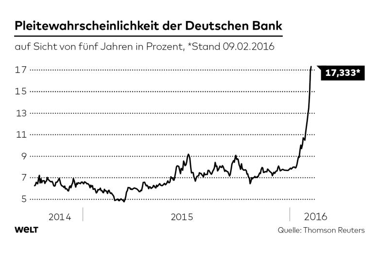 В цифрах отражается огромная потеря банком доверия со стороны рынков. Участники рынка оценивают риск того, что Deutsche Bank окажется в следующие пять лет в финансовом кризисе, более чем в 17 процентов. Это выше, чем в разгар кризиса еврозоны в 2012 году. Еще несколько дней назад теоретический риск банкротства составлял около 8 процентов.