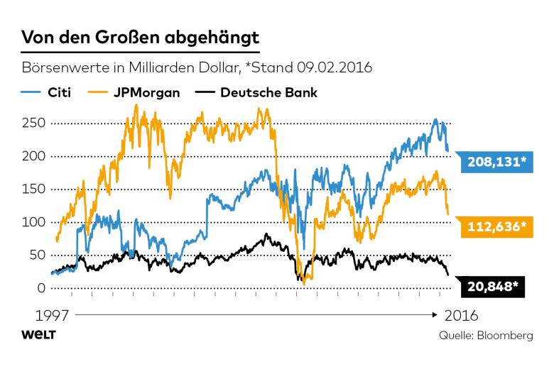 Однако Deutsche Bank, как кажется, далеко отошел от этого былого притязания. Имидж банка настолько подорван, что это угрожает отставанием от глобальных конкурентов. Такие гиганты с Уолл Стрит как JP Morgan стоят на бирже почти в десять раз больше, чем франкфуртский банк, и снова получают двузначные миллиардные прибыли. Было время, когда оба эти банка шли на равных - но оно давно прошло.