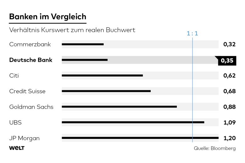 При этом банк можно сейчас купить задешево. На бирже акции Deutsche Bank торгуются всего лишь на уровне 35 процентов от его балансовой стоимости, то есть со скидкой в 65 процентов. Покупатель, который продаст одиночные активы и тем самым выведет чистые активы из баланса, мог бы вмиг получить выгоду в 65 процентов. Но потенциальные инвесторы, по-видимому, исходят из того, что балансовую стоимость, возможно, придется списать или же в бухгалтерском балансе таятся другие проблемы. Они не верят в быстрое улучшение ситуации.
