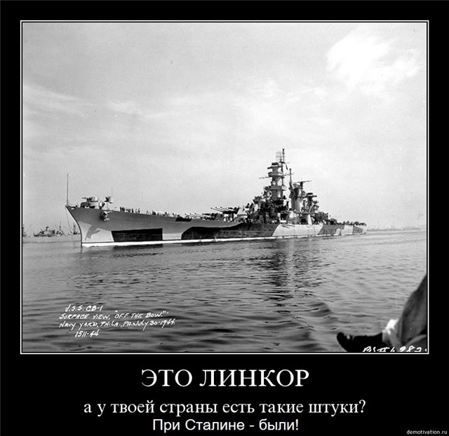 (IMG:http://s40.radikal.ru/i087/0909/07/cec17f278d42.jpg) Это ложь. Были линкоры царской россии. А ТАРК были построены уже после Сталина. Во-первых, "России". А то, что советские довоенные линкоры были построены ещё при Царе, так сохранить тоже надо уметь. Ельцинская камарилья сумела в рекордно короткие сроки разбазарить и свести почти на нет один из самых мощных современных флотов мира - советский. Но, по существу, должен признать, что именно данный плакат я выбрал неудачно. И вот по какой причине: Действительно, до революции линкоры построили, но, их постройка отразила начавшийся комплексный кризис нашей страны - построили всего четыре, а надо бы десяток, так что всю первую мировую новые линкоры простояли на базе и сыграли немалую роль в революциях и крахе Российской Империи - ядром революционных сил в Петербурге были матросы стоявших без дела и разложенных революционной пропагандой экипажей линкоров и других больших кораблей. В принципе, уже во 2МВ сражения тяжелых артиллерийских кораблей друг с другом можно пересчитать по пальцам одной руки. Самые лучшие в мире тяжелые крейсера и самые мощные линкоры - Японские - все были потоплены авиацией или мини-подлодками, которые пробирались в гавани и закладывали мощные мины. На остальных театрах военных действий происходило тоже нечто подобное - тяжелые корабли топила, в основном, авиация. Поэтому, последние линкоры строились уже в какой-то степени, по инерции - должны быть тяжелые корабли и все тут. А главной единицей флота стал авианосец. Цитата "Эти корабли напоминают каллиграфические религиозные свитки, которые старики развешивают в своих домах. Они не доказали своей ценности. Это только вопрос веры, а не реальность." "Линкоры будут полезны Японии в будущей войне так же, как самурайский меч" - адмирал Исороку Ямамото В СССР до войны затыкали экстренные дырки и строили, в основном, эсминцы, крейсера и подлодки, которые, кстати, и несли основную нагрузку в ходе Великой Отечественной Войны и нас и ВМВ для "Запада". Старые броненосцы (типа Потемкина") устарели еще к 1914 г., а линкоров современного типа было немного, еще меньше пережили гражданскую войну, да и они к 50-м устарели безнадежно. Поэтому, еще до войны была заложена новая серия линкоров "Советский Союз" - вершина,можно сказать линкорного строения. После войны, новые линкоры не стали достраивать, причем, решение это было принято еще при Сталине, т.к. после войны этот класс себя не оправдывал. США оставили какую-то часть своих линкоров, но они и попилили их ОЧЕНЬ много. Причем, количество построенных США линкоров также нельзя сравнивать с построенными кораблями в СССР, т.к. страны имеют совершенно разное геостратегическое положение и внешняя политика, так что СССР были более важны танки, а не линкоры, а США - наоборот. Поэтому, в США ситуация была другой. После ВМВ в распоряжении США оказалось слишком много линкоров, так что, большую часть они распилили, а самые лучшие, поздних серий, остались в строю. Применение им нашлось, хотя и далекое от первоначальных доктрин - быстро обнаружилось, что линкор очень неплох не только в утоплении всяких корыт малого и среднего водоизмещения, но и отличное средство огневой поддержки при, например, "защите интересов США" во всяких приморских государствах, сомневающихся в выборе экономических партнеров или социальной системы. В результ