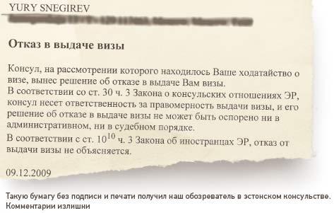 ![]() Корреспонденту "Известий" Юрий Снегирёв Первый (и возможно, последний) раз я был в Эстонии в 2007 году. Сразу после того, как Таллин сотрясли беспорядки "бронзовой весны". Тогда во время варварского переноса могил советских воинов-освободителей с площади Тынисмяги вся русская диаспора вышла на улицы в знак протеста. Но правительство во главе с Андрусом Ансипом поступило по-тоталитарному: в ход пошли полицейские дубинки, а в пустующих ангарах морского порта срочно организовали тюрьму народов. Туда стаскивали избитых туристов, предварительно сковав руки нейлоновой лентой. Стальных наручников на всех не хватало. Был убит российский гражданин Дмитрий Ганин. Убийцы до сих пор не найдены. В своих репортажах я всего лишь попытался передать атмосферу черных для Эстонии дней, когда разгоралась гражданская война. Я записывал слова тех, кто родился и вырос в Эстонии. Тех, кто борется с возрождающимся с попустительства эстонских властей фашизмом. И тех, кто поддержал действия полиции и встал по другую сторону баррикад. А как же иначе? Я прежде всего репортер. Сказать, что Россия в те дни негодовала - промолчать. К эстонскому посольству в Москве было не пробраться - его блокировали пикеты. Чтобы репортер "Известий" смог попасть в Эстонию, тогдашний консул республики пошел на исключение из правил. Я получил эстонскую визу без проволочек и прочих формальностей в Петербурге. В Эстонии я вел себя безукоризненно. Дорогу переходил на зеленый. Да спросите шпиков, которые неотлучно следовали за мной. "Хвост" я подцепил после того, как встретился с активистами "Ночного дозора" - общественной организации, защищавшей памятник солдату. До этого я сидел в баре с эстонскими скинхедами. Хвоста еще не было. Два неприметных гражданина попеременно следовали за мной. Учитывая, что улицы Таллина после погромов были пусты, не заметить я их просто не мог! Лидер "Ночного дозора" Дмитрий Линтер тогда сидел в тюрьме. Встретился я с ним уже в Москве. Когда его выпустили через 7 месяцев за недоказанностью вины. Мне довелось вручать дозоровцу ежегодную премию "Известность" - двухкилограммовый латунный брусок в форме буквы "И". Минувшей осенью Линтер опять был в Москве. Рассказал много интересного об Эстонии. И я собрался туда в командировку. Редакция написала письмо на имя консула Эстонии в Москве Юлле Соосалу. Я позвонил Юлле - она раньше служила пресс-атташе посольства. Коллега, так сказать. - Проблем в получении визы не должно быть, - заверила тогда она меня. Я отдал 70 евро в стеклянное окошко и стал ждать ответа. Уже через день из консульства позвонили и попросили зайти пораньше. Дама протянула мне паспорт без визы и бумагу, в которой значилось, что мне отказано в визе без объяснения причин и что причины эти я не могу узнать ни при каких обстоятельствах, а 70 евро пошли в доход государства и возврату не подлежат. - Как так? Госпожа консул уверяла, что будет все в порядке... - под нежным взглядом охранника я робко пытался "качать права". - В бумаге все указано, - эстонка не мигая смотрела на меня. "Эстония - часть Евросоюза, где чтят демократические принципы, - думал я. - Нет, они не могут отказать журналисту выполнять свой профессиональный долг". Но вопрос остался. Я твердо решил провести рождественские праздники в Таллине, более того - отправиться туда после свадьбы. И вновь подал доку