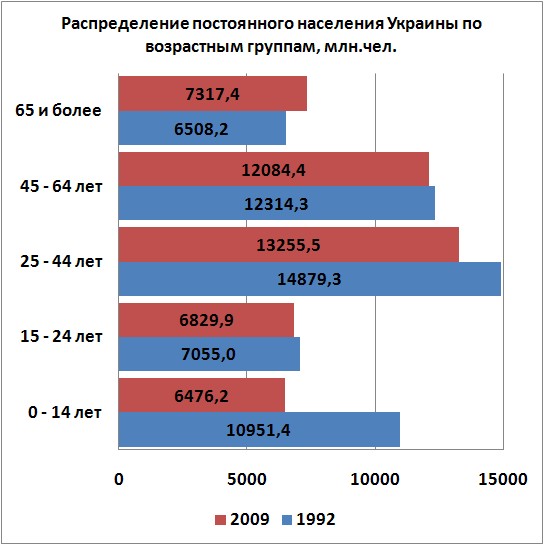 Статистические данные взяты из официальных данных Государственного комитета статистики Украины ( www.ukrstat.gov.ua ). Итак. 1. Распределение постоянного населения Украины по возрастным группам, млн.чел. ![]() 2. Изменение численности возрастных групп постоянного населения Украины с 1 января 1992г. по 1 января 2009г.