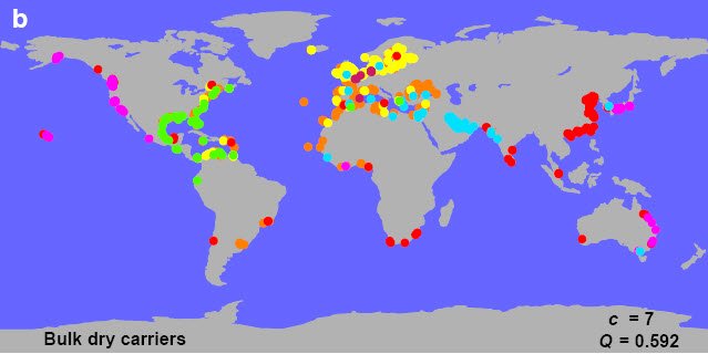 Как известно, 90% всего мирового грузооборота приходится на морской транспорт. Не смотря на это, вплоть до недавнего времени попыток провести комплексный анализ сети морских транспортных перевозок было не много, в отличие от исследований связанных с анализом транспортных задач автомобильного, ж/д- и авиа-транспорта. Недавно несколько ученых из Университета Ольдинбурга (Германия) провели такой анализ, используя данные о более чем 16 000 маршрутах между 951 портами, и выявили следующие факты (кратко): * Морская транспортная сеть представляет собой структуру типа "small world network" (это такой тип математических графов, в которых большинство узлов не являются соседними, но большинство вершин графа могут быть достигнуты за небольшое количество шагов. Пример: теория 6 степеней удаленности или 6 рукопожатий, http://en.wikipedia.org/wiki/Small-world_network, ); * Средняя длина пути между двумя случайными портами составляет 2,5 перехода, в отличие от авиасообщения, где аналогичный параметр составляет 4,4 перелета. * Морская сеть является ассиметричной: более половины всех портов связаны между собой только в одном направлении, то есть доставка груза редко происходит по принципу "туда и обратно"; * Пожалуй, наиболее интересным является то, что транспортная сеть различных классов судов образует разные паттерны. Исследователи проанализировали схемы движения трех типов судов: контейнеровозов, сухогрузов и нефтяных танкеров. И если контейнеровозы, как правило, имеют регулярный характер движения, то движение части сухогрузов и нефтяных танкеров носит гораздо менее регулярный характер. Это может объяняться тем, что большое количество сухогрузов и нефтяных танкеров чаще всего ходит пустыми. Это исследование дает возможность по-новому взглянуть на структуру мировой торговли, а также может помочь морским биологам в анализе влияния человека на распространение видов организмов, переносящихся морскими судами. От себя могу добавить, что авторы хорошо знают методы анализа социальных сетей, но тема СевМорПути не раскрыта. Ссылка: http://arxiv.org/abs/1001.2172 Ниже несколько картинок: Рис. Сеть морских грузовых перевозок (в легенде - степень централизации, степень кластеризации, связности и прочие) ![]()