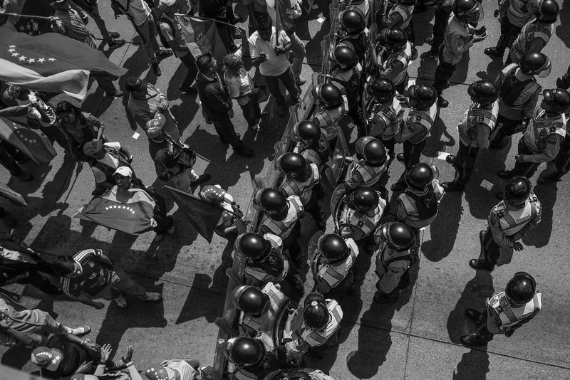 Сотрудники национальной полиции в экипировке спецподразделений блокируют дорогу к Национальному избирательному совету во время марша протеста сторонников оппозиции, требующих референдума для снятия Мадуро, в Каракасе 23 января.