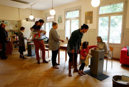 Люди опускают свои бюллетени во время голосования о том, следует ли предоставить каждому взрослому гражданину страны базовый гарантированный ежемесячный доход в 2500 швейцарских франков (2560 долларов), в школе в Берне, Швейцария, 5 июня 2016 г. Рейтер/Рубен Шприх