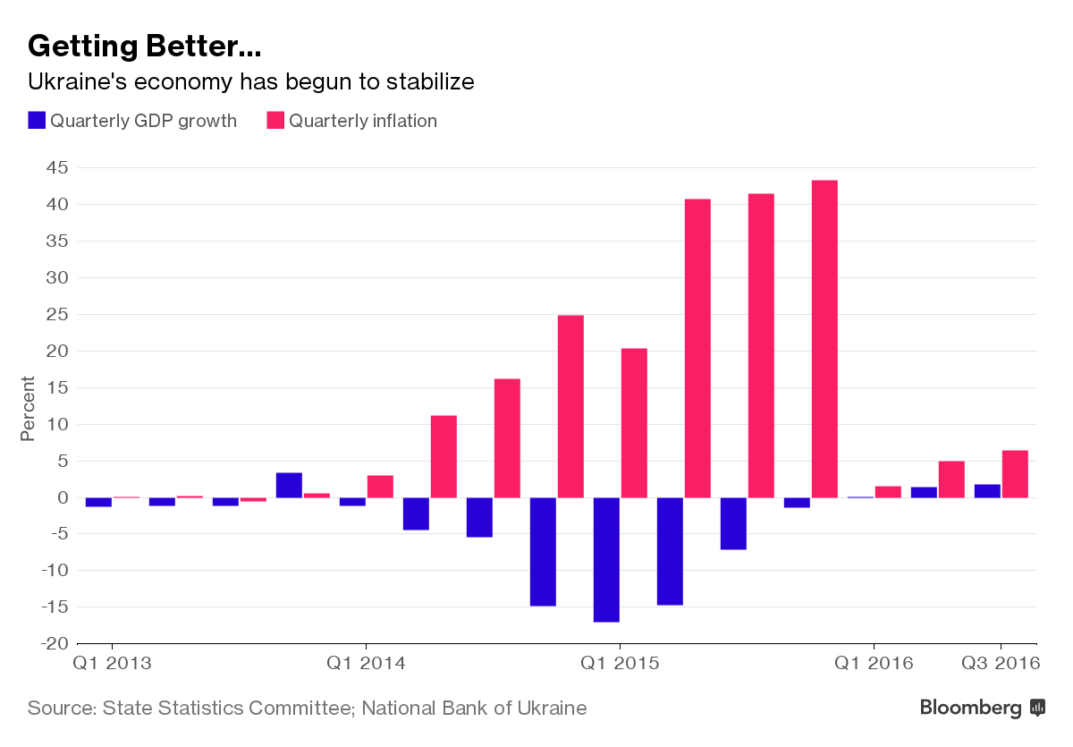 Это ощущение передается и на рынке облигаций, где украинские долговые обязательства являлись перспективным вариантом в течение большей части этого года, так как валюта и инфляция стабилизировались, а экономический рост медленно продвигался в сторону положительных значений. Доход по трехлетним украинским облигациям вырос более чем на два процентных пункта после выборов в США, так как инвесторы обратились в бегство.