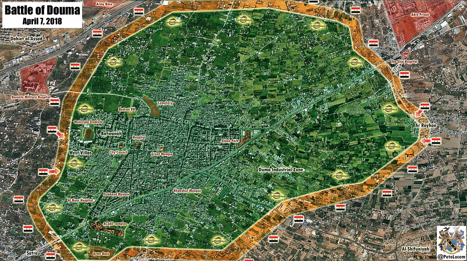 За последние месяцы сирийская армия взяла под свой контроль 90% анклава "повстанцев" в восточной Гуте, прямо рядом с сирийской столицей Дамаском. Только городок Дума, удерживаемый салафистами-такфиристами "Джаиш аль-Ислам", финансируемой саудами, остался в руках противника. Шли переговоры о вывозе террористов. В какой-то момент на прошлой неделе бескомпромиссные лидеры "Джаиш аль-Ислам" отозвали своих переговорщиков с переговоров и, согласно сообщениям, казнили их. "Джаиш аль-Ислам" хотела по сути остаться на месте и сохранить все свое оружие. Российские переговорщики не согласились на это. В пятницу переговоры закончились провалом.