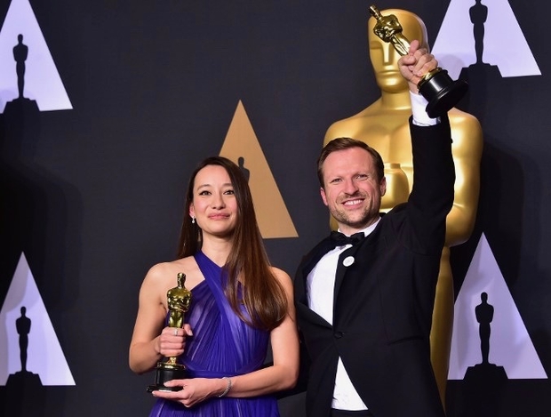 Продюсер "Белых касок" Джоанна Натасегара и режиссер Орландо фон Айнзидел получают "Оскаров" за лучший документальный короткометражный фильм (AFP)