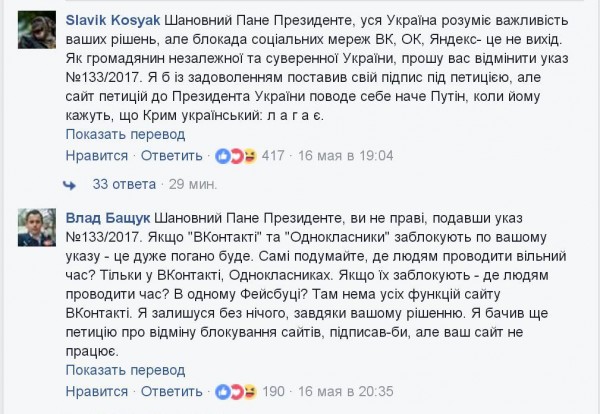 Зашёл недавно на фейсбучную страничку Порошенко и увидел: комментаторы в подавляющем большинстве возмущаются. Смысла вымарывать неприятные комментарии ведущему президентскую страничку ответственному лицу не было – уж слишком очевидно общее критическое отношение к запрету. На момент, когда я зашёл на страничку, у украинского президента основной темой было “З Прем’єр-міністром Республіки Мальта обговорили поглиблення торговельно-економічного та секторального співробітництва між нашими країнами”. Однако почти всех комментаторов интересовала лишь проблема блокировки доступа к вышеуказанным сайтам.