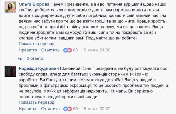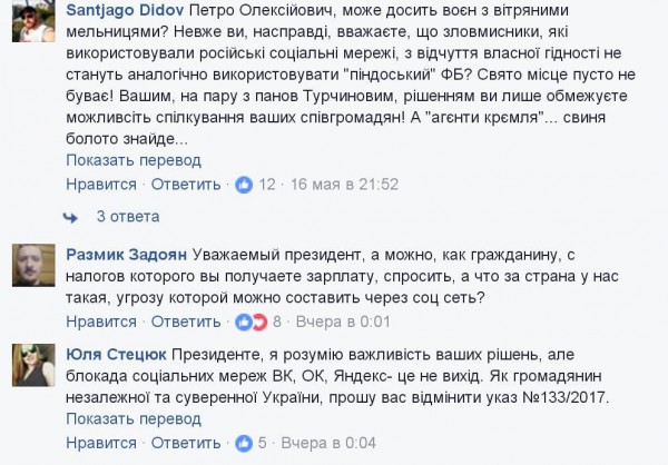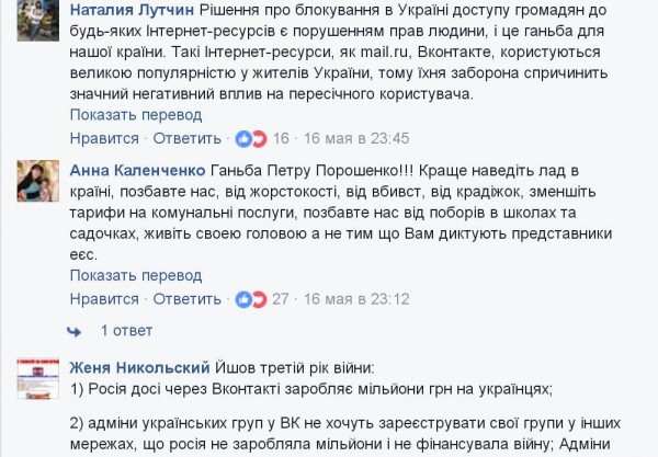 P.S. Вообще-то на ФБ-странице украинского президента Порошенко после того, как подавляющее большинство комментаторов выразило возмущение запретом, его более поздний пост - "Одразу після припинення агресії РФ, після того, як останній солдат РФ залишить Україну, рішення про санкції щодо соцмереж буде переглянуто” - вызвал внезапное одобрение запрета уже от других комментаторов, мол, так и надо и давно пора. Фокусник.