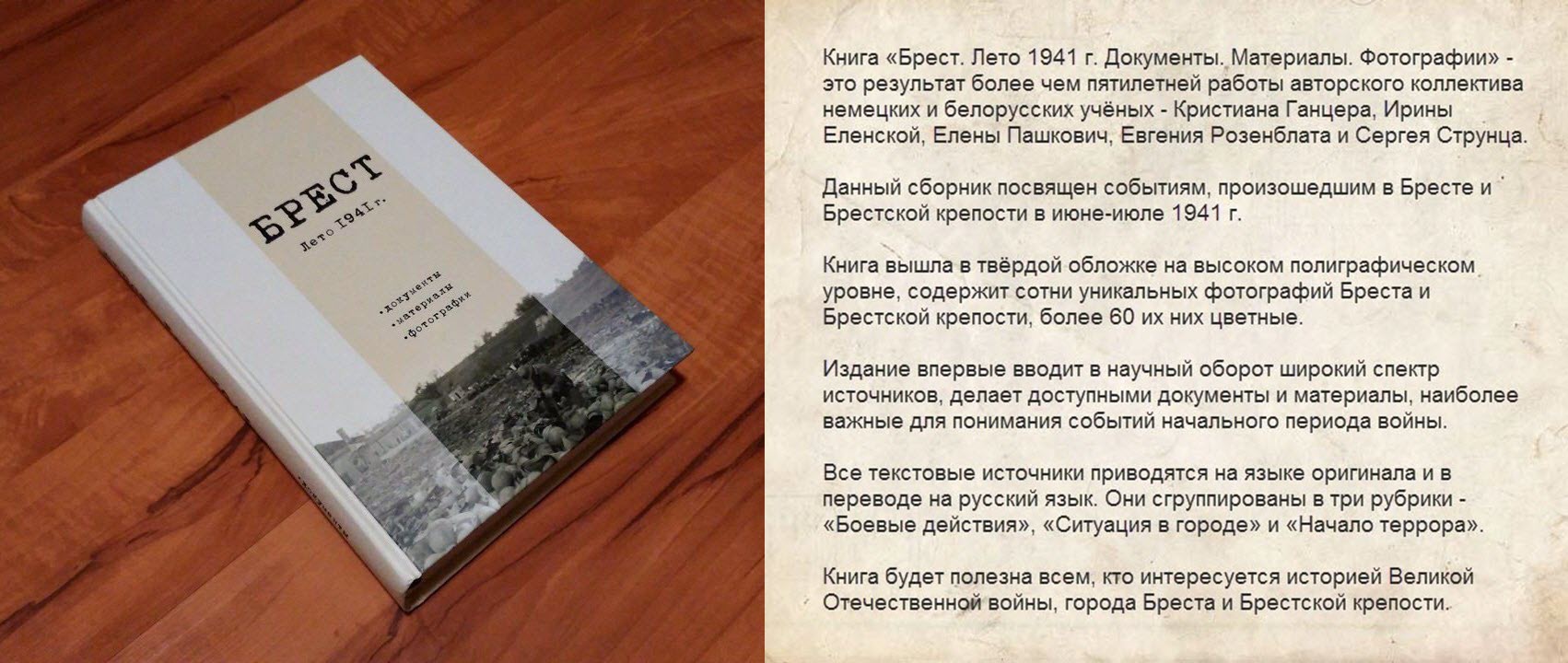 Книга вышла в твердой обложке на высоком полиграфическом уровне, в ней сотни уникальных фотографий Бреста и Брестской крепости, сделанных в июне—июле 1941 года, из них более 60 в цвете. В издании 724 страницы.