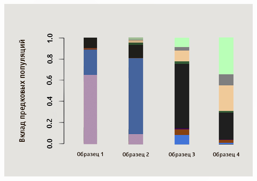 Для статистического анализа использовали программу ADMIXTURE, которая позволяет оценить наиболее вероятное происхождение индивида на основании данных о генотипах. Кроме нее авторы обсуждаемой статьи применяли и другие статистические методы, давшие сходный ответ на поставленный вопрос. Мы остановимся на ADMIXTURE, так как именно этот алгоритм позволяет оценить процентный вклад предковых популяций в изучаемые геномы.