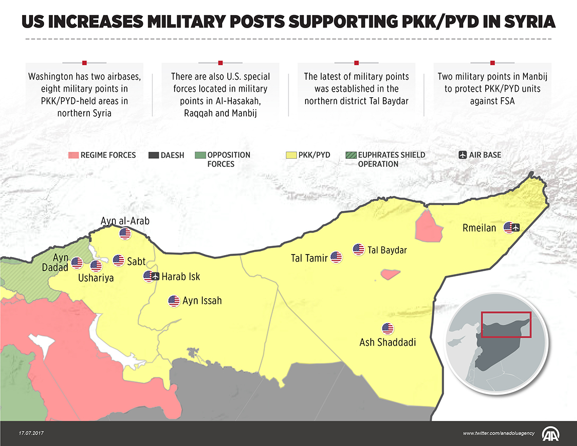 Вашингтон создал две авиабазы в контролируемом РПК/ПДС районе Румейлан в северо-восточной провинции Аль-Хасака в октябре 2015 года и в деревне Хараб Иск в южном Кобани в марте 2016 года.