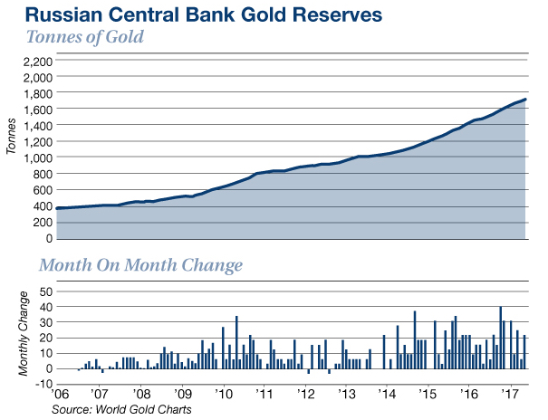 Китай, Россия и Индия накапливают значительные объемы золота. Большое количество золота идет на Ближний Восток и в другие азиатские страны. Нижеприведенный график показывает устойчивое накопление золота Россией за последнее десятилетие.