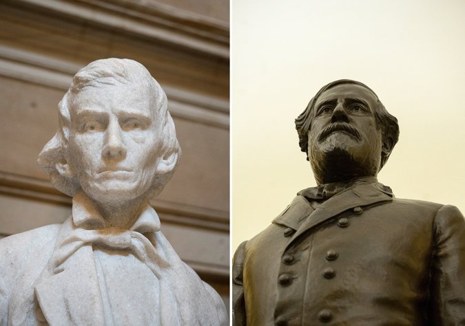 Слева направо: статуи Александра Стивенса, вице-президента Конфедерации, и Роберта Э. Ли, генерала Конфедерации, выставлены в Капитолии. Фото - Джастин Т. Геллерсон для "Нью-Йорк Таймс"