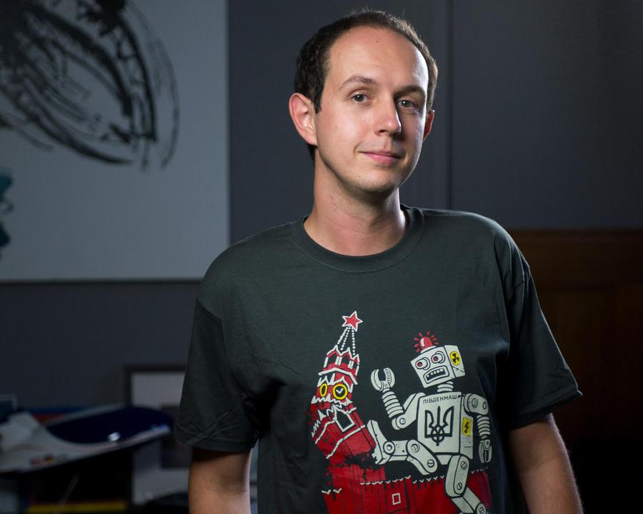 Ярема Дух, пресс-атташе украинского президента, высмеивает Россию в Твиттер-аккаунте @Ukraine, в котором он пишет вместе с двумя коллегами. На его футболке изображен украинский робот, рушащий пинком кремлевскую башню. Фото: Артем Жуков
