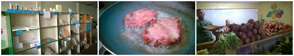 Слева направо: Государственный магазин — бодЕга — на 26-й улице в Ведадо, Гавана; праздничный ужин — бистЕки из свинины; овощной рынок — Агро — возле остановки «Зоопарк» в Ведадо Фото: из личного архива